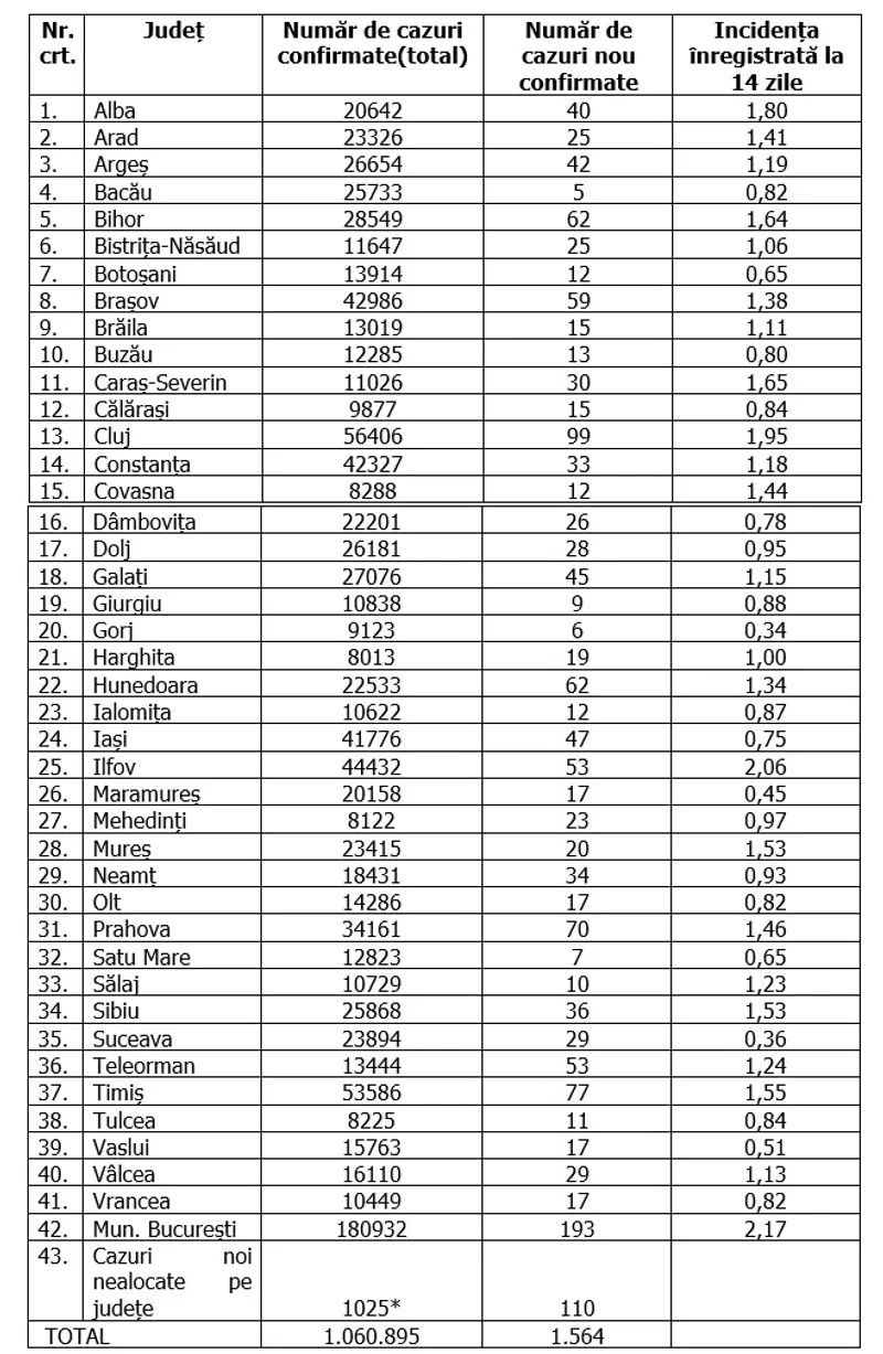 În total, în România au fost confirmate 1.060.895 de cazuri de infectare cu coronavirus, iar 28.616 de oameni infectați au murit.