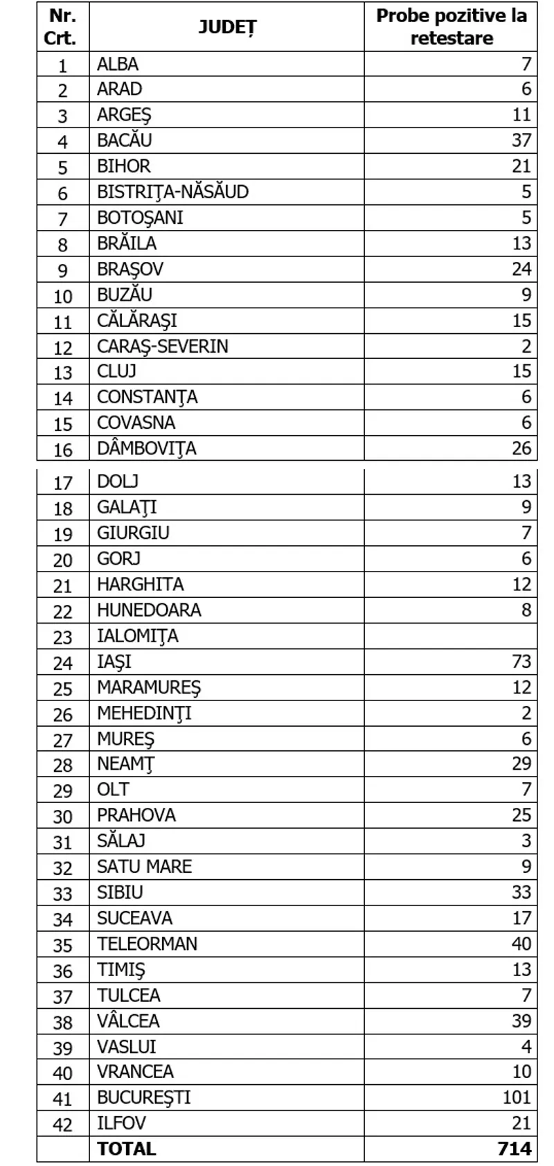 Distinct de cazurile nou confirmate, în urma retestării pacienților care erau deja pozitivi, 714 persoane au fost reconfirmate pozitiv.