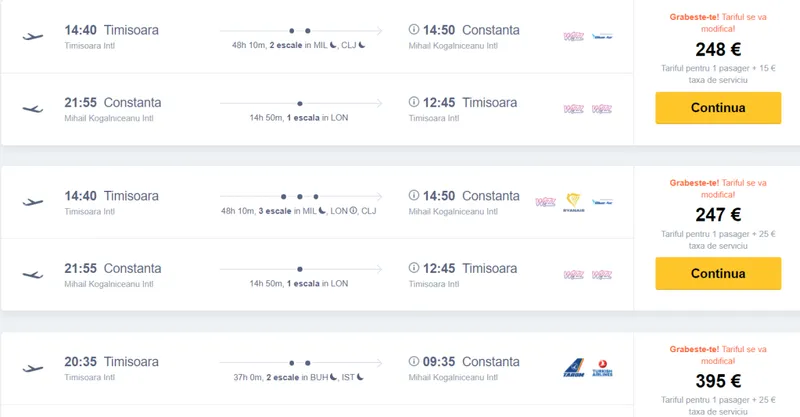 Da, ați remarcat bine, pentru a ajunge de la Timișoara la Constanța, trebuie să faci escale fie la Milano și Cluj-Napoca, fie la Londra, fie la București și Instanbul.