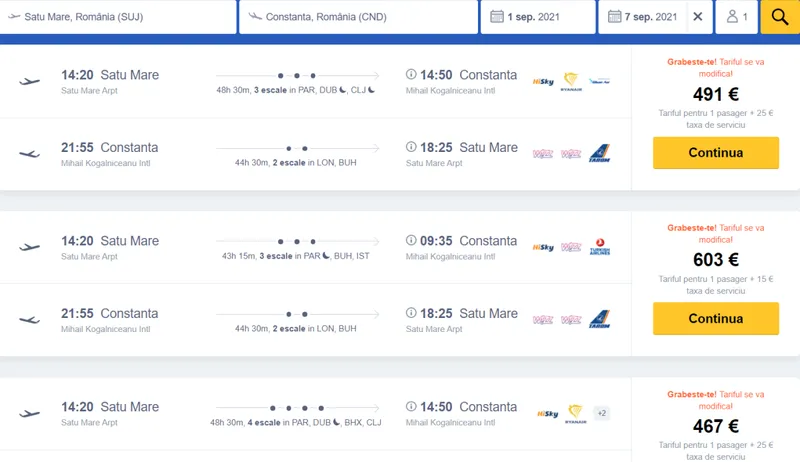 Situația nu e mai bună nici dacă pleci de la Satu Mare spre litoralul românesc. Cel mai rapid zbor, adică 87 de ore și 45 de minute, costă 603 de euro. Cel mai ieftin e 467 de euro, dar ajungi la Constanța în 93 de ore. Iar cel mai bun, zice site-ul specializat, e de 491 de ore, în doar 93 de ore.