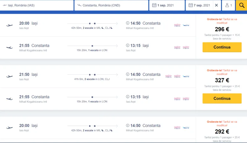 Astfel, am căutat un zbor de la Timișoara la Constanța pentru datele 1 septembrie (plecare) - 7 septembrie (întorcere). Cel mai ieftin drum oferit de un site specializat este, la momentul scrierii acestui articol, de 247 de euro. Cel mai rapid costă 395 de euro. De persoană.