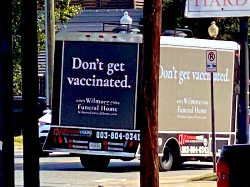 O campanie inedită pentru a încuraja oamenii să se vaccineze a folosit sloganul „Nu te vaccina" pe un camion pe care scire că aparține unei companii de pompe funebre din Charlote, Carolina de Sud, SUA. Imaginea a devenit rapid virală pe rețelele de socializare.