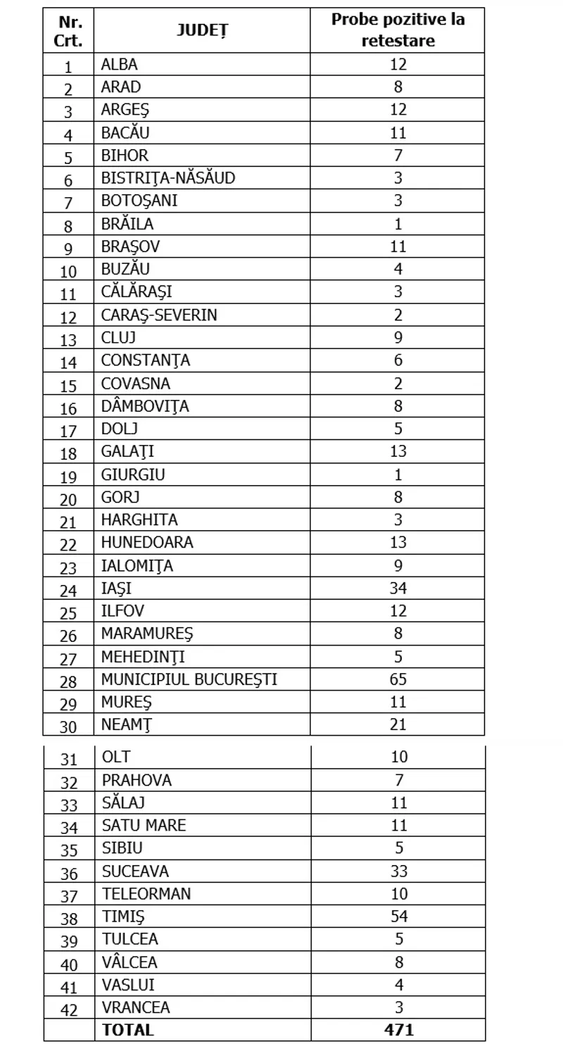 Distinct de cazurile nou confirmate, în urma retestării pacienților care erau deja pozitivi, 471 de persoane au fost reconfirmate pozitiv.