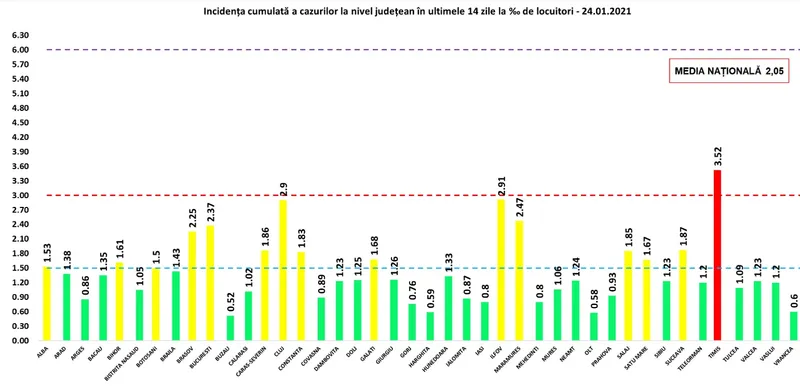 Județul Timiș este singurul din țară care mai raportează o rată de infectare de peste 3 la mia de locuitori - 3,52 cazuri la mia de locuitori. Capitala, unde autoritățile vor să relaxeze restricțiile de luni, raportează o incidență de 2,37 la mie, iar Clujul are o rată de infectare de 2,9 la mie. Ilfovul raportează o incidență de 2,91 la mie, fiind de asemenea în scenariul galben.