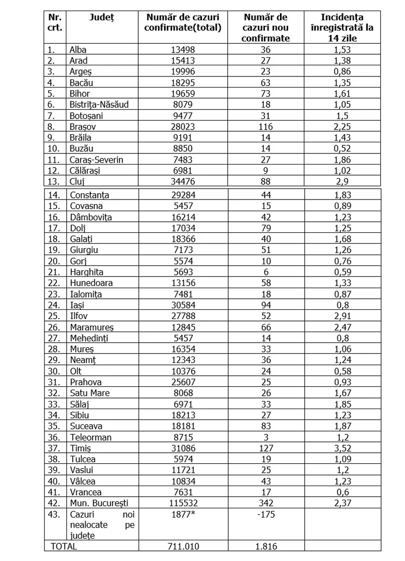 În total, în România au fost confirmate 711.010 cazuri de infectare cu coronavirus, iar 17.776 de oameni care aveau COVID-19 au murit.