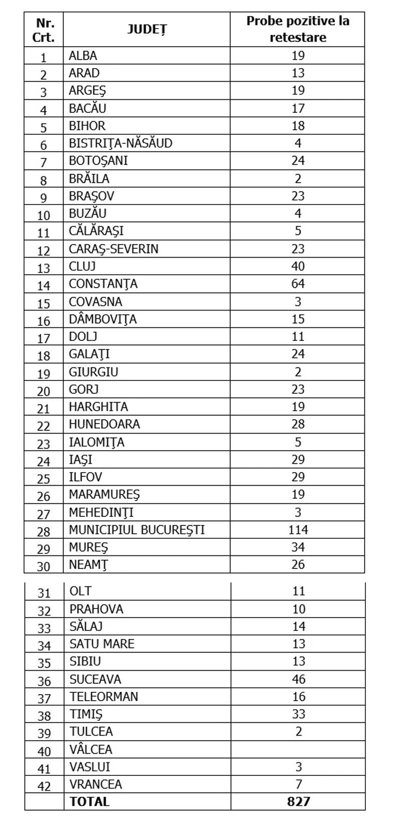 Distinct de cazurile nou confirmate, în urma retestării pacienților care erau deja pozitivi, 827 de persoane au fost reconfirmate pozitiv.