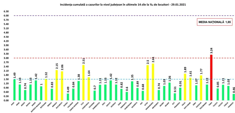 Județul care raportează încă o incidență din zona roșie este Timiș, cu 3,24 la mie.