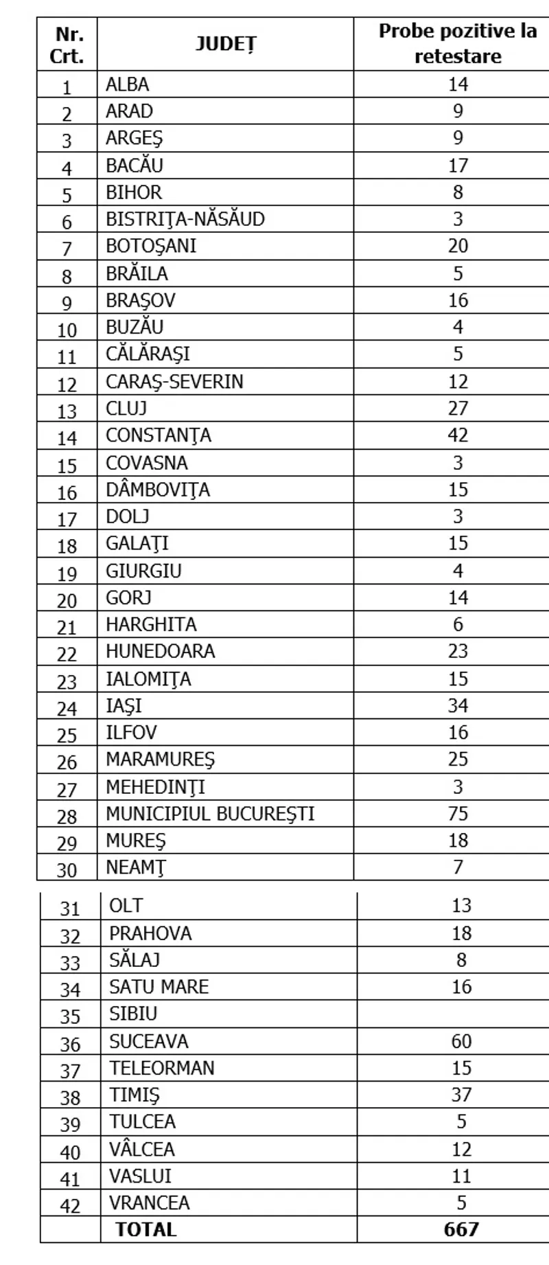 Distinct de cazurile nou confirmate, în urma retestării pacienților care erau deja pozitivi, 667 de persoane au fost reconfirmate pozitiv.