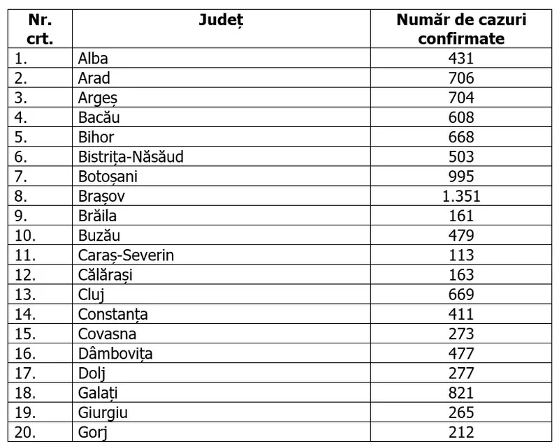 În ultimele 24 de ore, au murit 14 oameni infectați cu Covid-19: „În intervalul 25.06.2020 (10:00) – 26.06.2020 (10:00) au fost înregistrate 14 decese (7 bărbați și 7 femei), ale unor pacienți infectați cu noul coronavirus, internați în spitalele din Argeș, Botoșani, Brăila, Brașov, Constanța, Gorj, Ilfov și Vrancea.