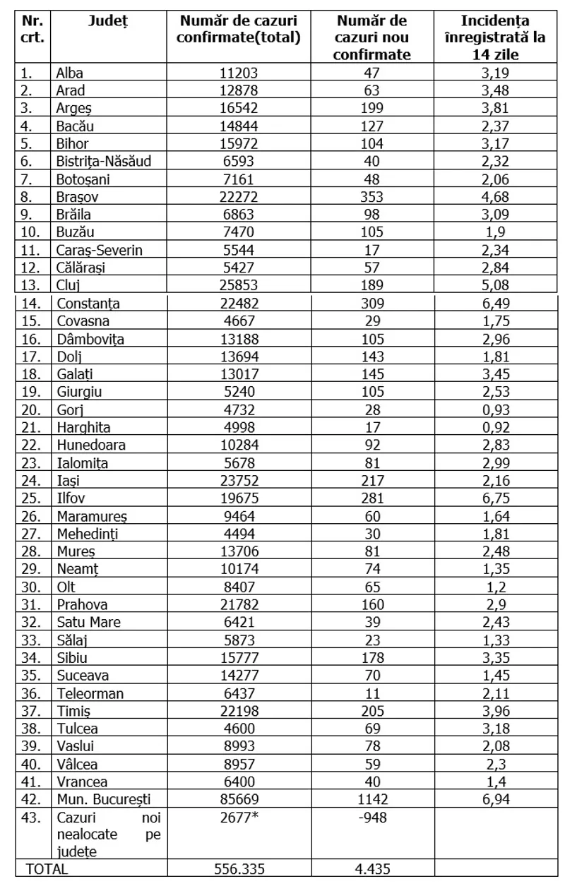 În total, în România au fost confirmate 556.335 de cazuri de infectare cu coronavirus, iar numărul oamenilor confirmați care au murit a ajuns la 13.385.