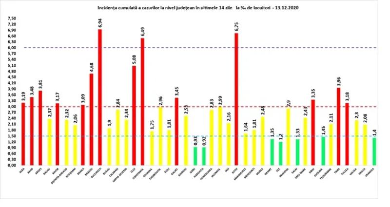 Coeficientul infectărilor cumulate la 14 zile, raportate la 1.000 de locuitori este calculat de către Direcțiile de Sănătate Publică, la nivelul Municipiului București și al județelor. Mai jos aveți graficul realizat în baza raportărilor primite de CNCCI de la Direcțiile de Sănătate Publică: