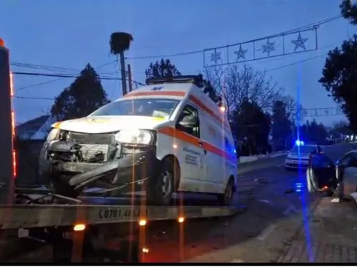 În urma impactului violent ambulanța a fost avariată în partea din față, în timp ce autoturismul Volkswagen a fost lovit în partea din stânga spate și rotit la 180 de grade pe șosea.
