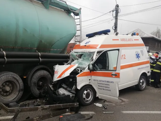 O ambulanță a Serviciului Județean, care se afla în misiune, s-a izbit violent de o cisternă plină cu furaje. Asistenta echipajului se află în stare gravă.