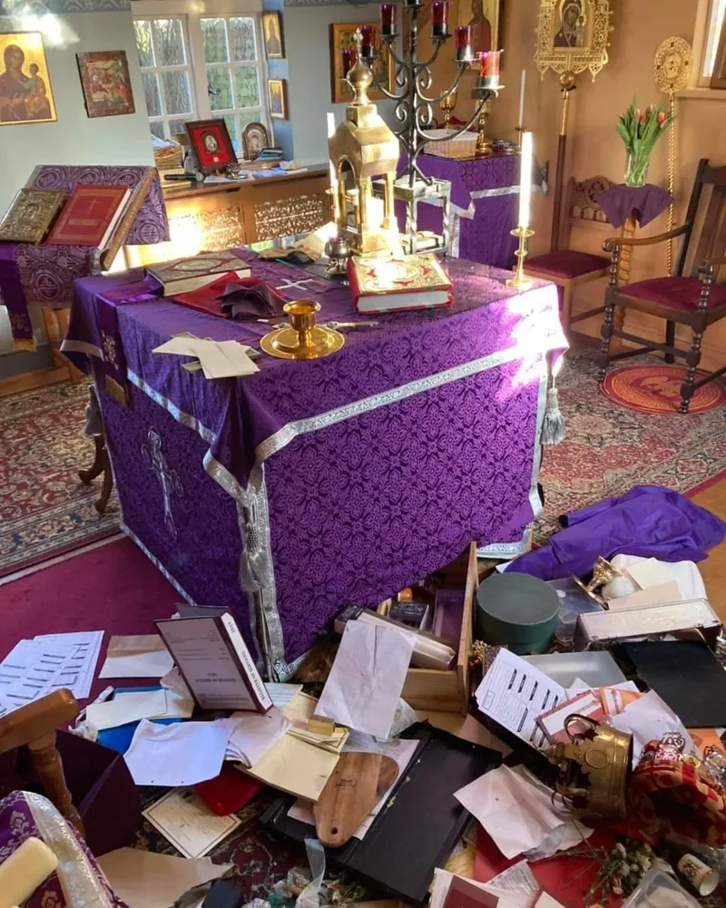 „Sfântul Altar a fost jefuit şi au fost sustrase diverse obiecte, între care relicve sfinte, cruci şi vase de altar. Din fericire, deşi Sfânta Masă a fost răvăşită, antimensiunea şi tabernaculul cu Sfintele Daruri nu au fost atins”, a adăugat protopopul englez.