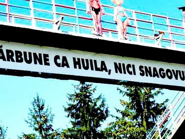Panoul reprezintă o imagine a cuplului Ceauşescu în costume de baie, iar în partea de jos se afla mesajul ”Nu-i cărbune ca huila, nici Snagovu' ca Petrila”.