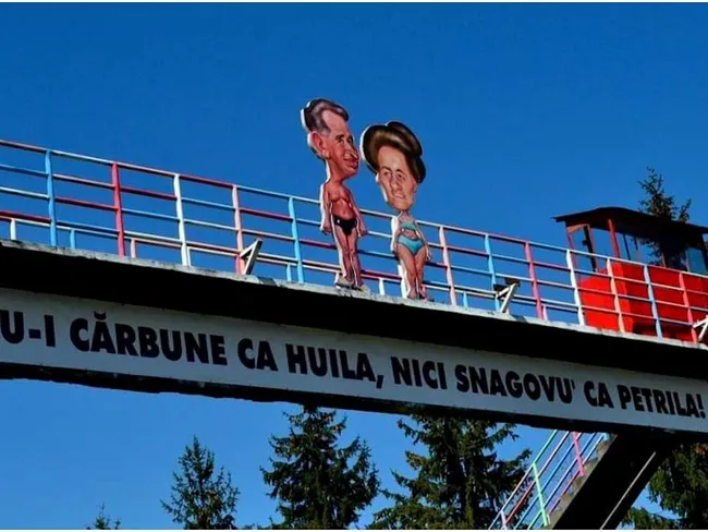 O caricatură a soţilor Ceauşescu, expusă în incinta fostei mine Petrila, a fost furată! Panoul reprezintă o imagine a soţilor în costume de baie, iar în partea de jos se afla mesajul „Nu-i cărbune ca huila, nici Snagovu' ca Petrila“.