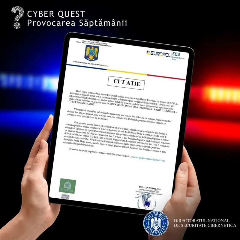 Experții de la Directoratul Național pentru Securitate Cibernetică avertizează cu privire la escrocheriile care circulă în numele autorităților de aplicare a legii, cum sunt Poliția, Europol sau Interpol.