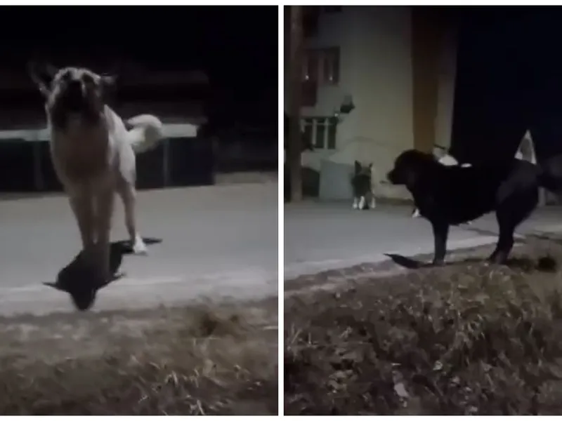 Femeia sa refugiat într-un șanț și a filmat animalele agresive. Un bărbat a sărit în ajutorul ei cu o bătă, alungând câinii violenți.