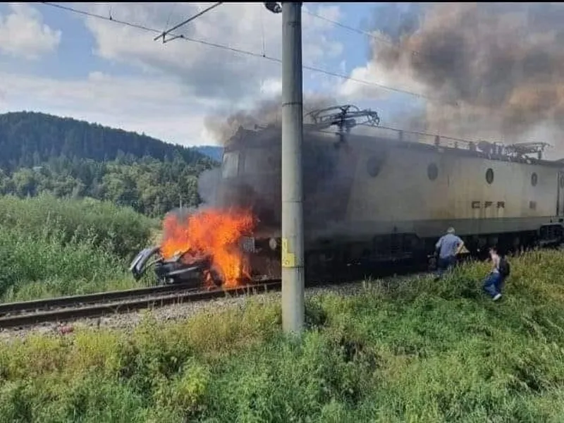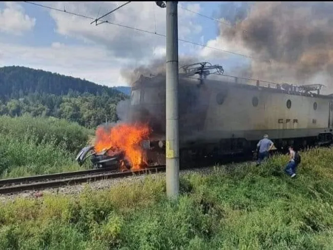 O locomotivă a luat foc după un accident cu un autoturism. Două persoane, carbonizate