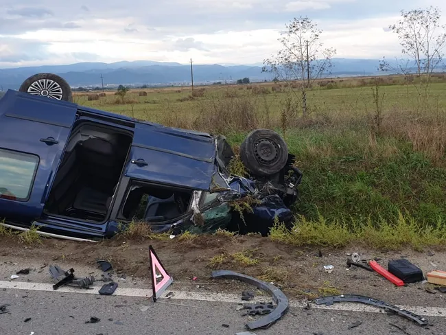Un accident rutier s-a produs duminică dimineaţa, la intrarea în localitatea Şura Mare, un autoturism pătrunzând pe contrasens şi intrând în coliziune cu un altul care circula în sens opus şi care s-a răsturnat în afara drumului, informează IPJ Sibiu.