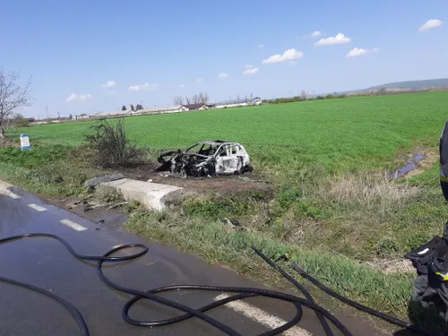 Pompierii din Iaşi au intervenit, luni, pentru stingerea unui autoturism electric, în urma unui accident rutier pe drumul judeţean DJ208.
