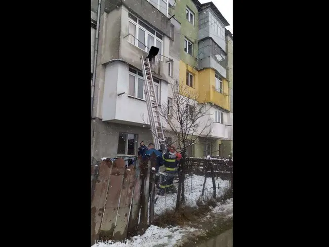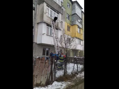 "ISU Sibiu a intervenit de urgenţă pe strada Brukenthal din Avrig, pentru a salva o persoană căzută de la etajul trei al unui imobil şi rămasă imobilizată în sârmele de rufe situate la etajul doi al imobilului.