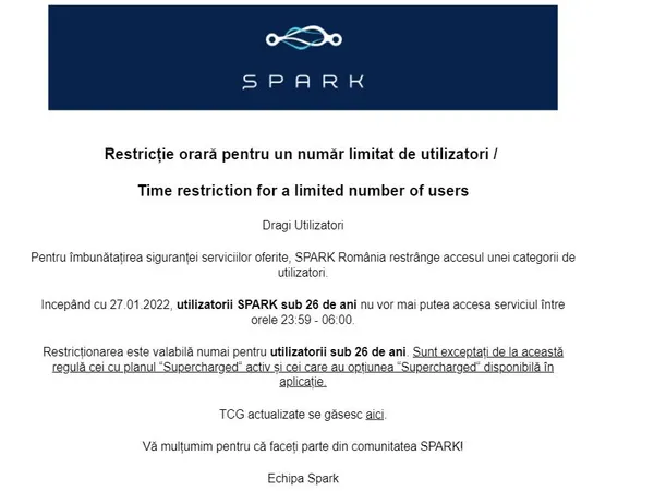 Utilizatorii serviciilor Spark au primit o notificare potrivit căreia, începând cu data de 27 ianuarie 2022, dacă au sub 26 de ani, nu vor mai avea acces în aplicație în intervalul orar 23.59 – 06.00.