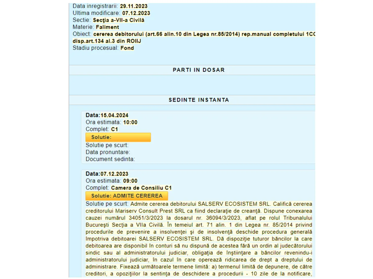 Firma de salubritate SC SALSERV ECOSISTEM SRL, care în anul 2022 raporta datorii de 27.745.943 lei la o cifră de afaceri de 25.796.554 lei potrivit Listefirme.ro, și-a cerut și-a cerut falimentul din cauza datoriilor, iar instanta a încuviințat pe data de 07.12.2023 începerea procedurii prin decizia în dosarul nr. 36094/3/2023, potrivit portal-justitie.ro.