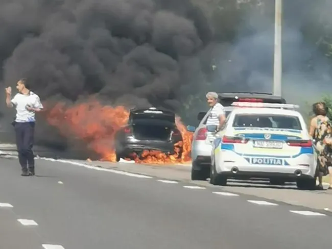 Panică pe Autostrada Soarelui, după ce o mașină a luat foc în mers