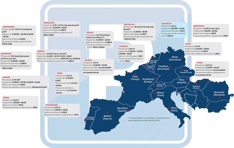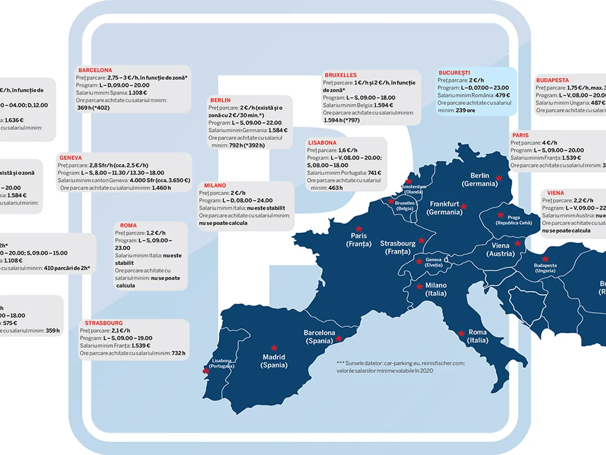 În comparație, tot din salariul minim brut, un maghiar poate parca 278 de ore în centrul Budapestei, un belgian - până la 1.594 de ore în centrul Bruxelles-ului, un ceh - 359 ore în centrul Pragăi, un francez - 384 ore în centrul Parisului etc.