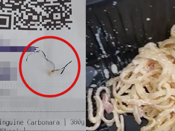 Un bărbat care a comandat o porție de paste carbonara și a primiti un ”bonus”. Pe lângă sos și șuncă, în caserolă era și o sârmă. Omul a rămas șocat. ”Este un bonus”, a spus el.