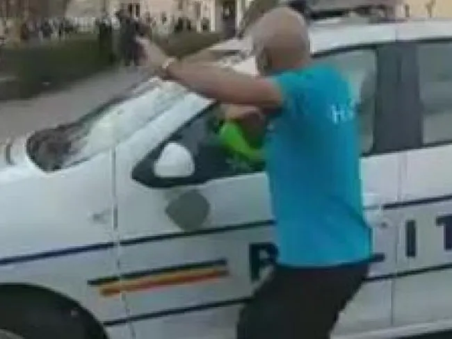 Pe imaginile distribuite pe reţelele de socializare se vede cum poliţiştilor li se adresează cuvinte grele. De asemenea, un bărbat loveşte cu cotul în geamul unei maşini de poliţie care are oglinda laterală smulsă.