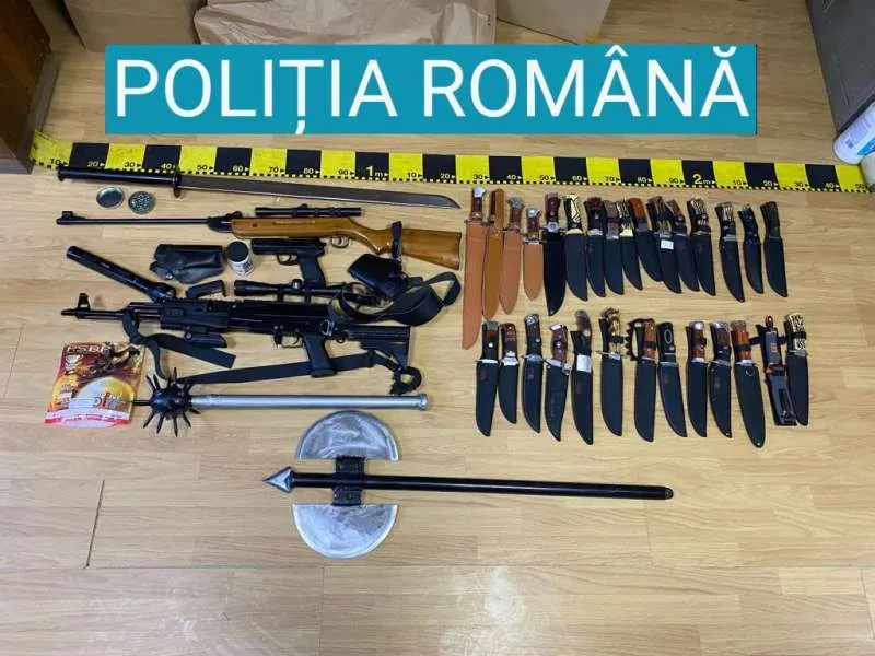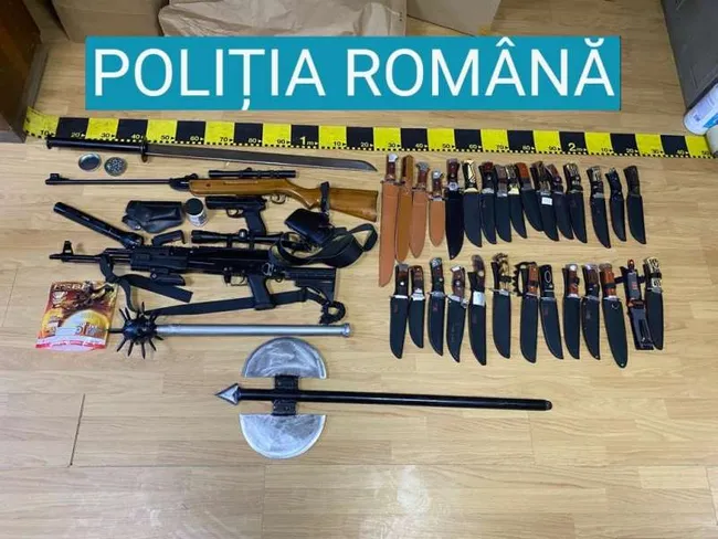"În urma percheziţiei, poliţiştii au identificat două arme tip puşcă, 29 de cuţite de diferite dimensiuni şi inscripţii, o halebardă, un pistol tip air-soft, două tocuri pentru pistol, o pungă cu bile pentru arme tip air-soft, un încărcător pentru baterii folosite la armele air-soft, o sabie metalică şi un buzdugan confecţionate artizanal", a precizat purtătorul de cuvânt al IPJ Bacău, inspectorul principal Cătălina Păduraru.