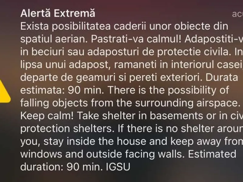 Mesajul, transmis în jurul orei 21:00, avertiza locuitorii din zonă asupra riscului ca obiecte din spaţiul aerian să cadă pe teritoriul României, ca urmare a activităţilor desfăşurate în conflictul din Ucraina.