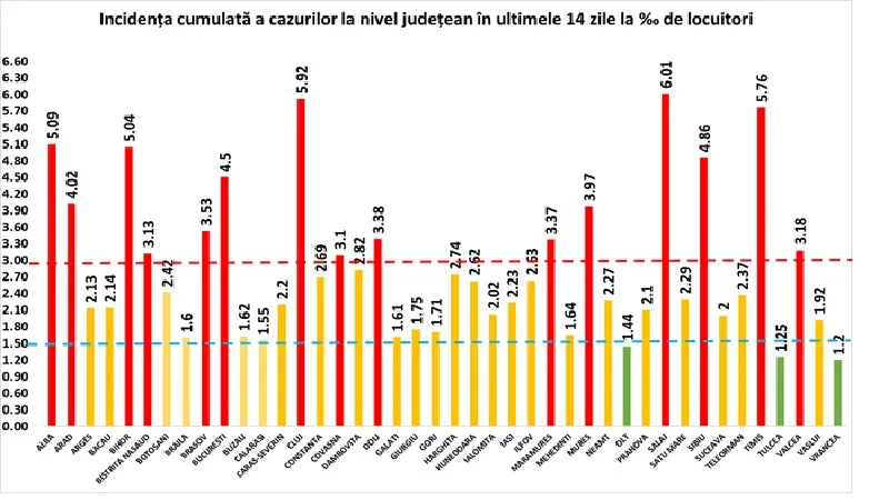 Coeficientul infectărilor cumulate la 14 zile, raportate la 1.000 de locuitori este calculat de către Direcțiile de Sănătate Publică, la nivelul Municipiului București și al județelor. Mai jos aveți graficul realizat în baza raportărilor primite de CNCCI de la Direcțiile de Sănătate Publică: