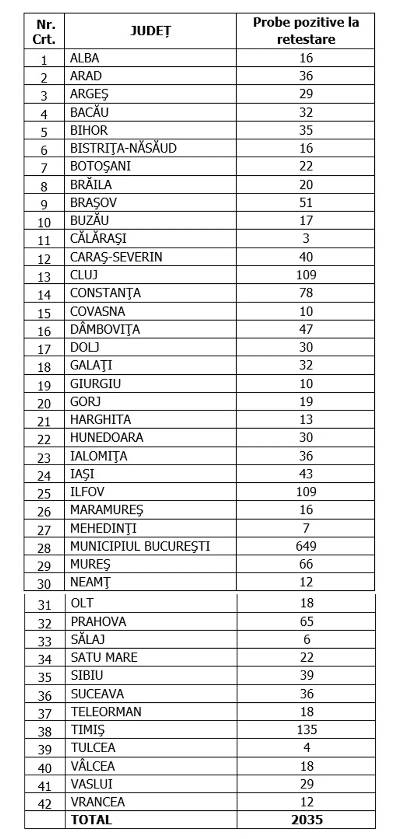 Distinct de cazurile nou confirmate, în urma retestării pacienților care erau deja pozitivi, 2.035 de persoane au fost reconfirmate pozitiv.