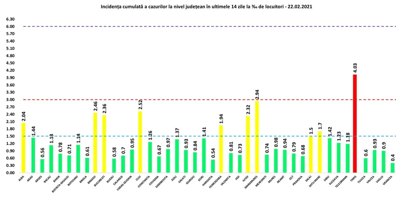 În județul Timiș, incidența a ajuns la 4,03 infectări la mia de locuitori. În total, alte opt județe și Capitala sunt în scenariul galben. În București, incidența este de 2,36 la mia de locuitori, iar județele cu cele mai mari rate de infectare sunt: Maramureș - 2,94 la mie, Cluj - 2,52 la mie, Brașov - 2,46 la mie, Ilfov - 2,32 la mie.