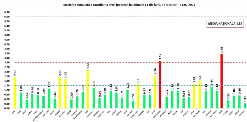 Județul Maramureș se menține în zona roșie pentru a doua zi consecutiv, cu o incidență de 3,12 la mia de locuitori, în vreme ce județul Timiș raportează o incidență de 3,56 infectări la mia de locuitori.