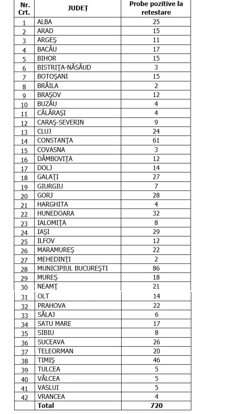 Distinct de cazurile nou confirmate, în urma retestării pacienților care erau deja pozitivi, 720 de persoane au fost reconfirmate pozitiv.