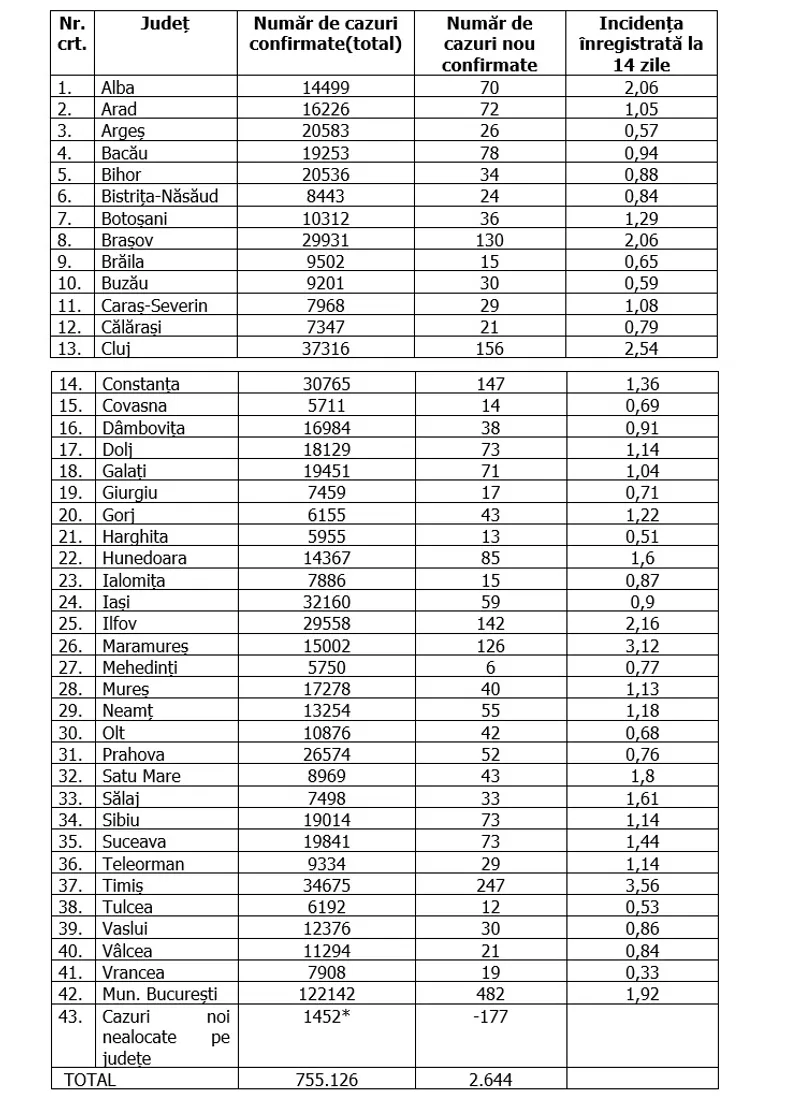 În total, în România au fost confirmate 755.126 de cazuri de infectare cu coronavirus, iar 19.200 de oameni infectați au murit.