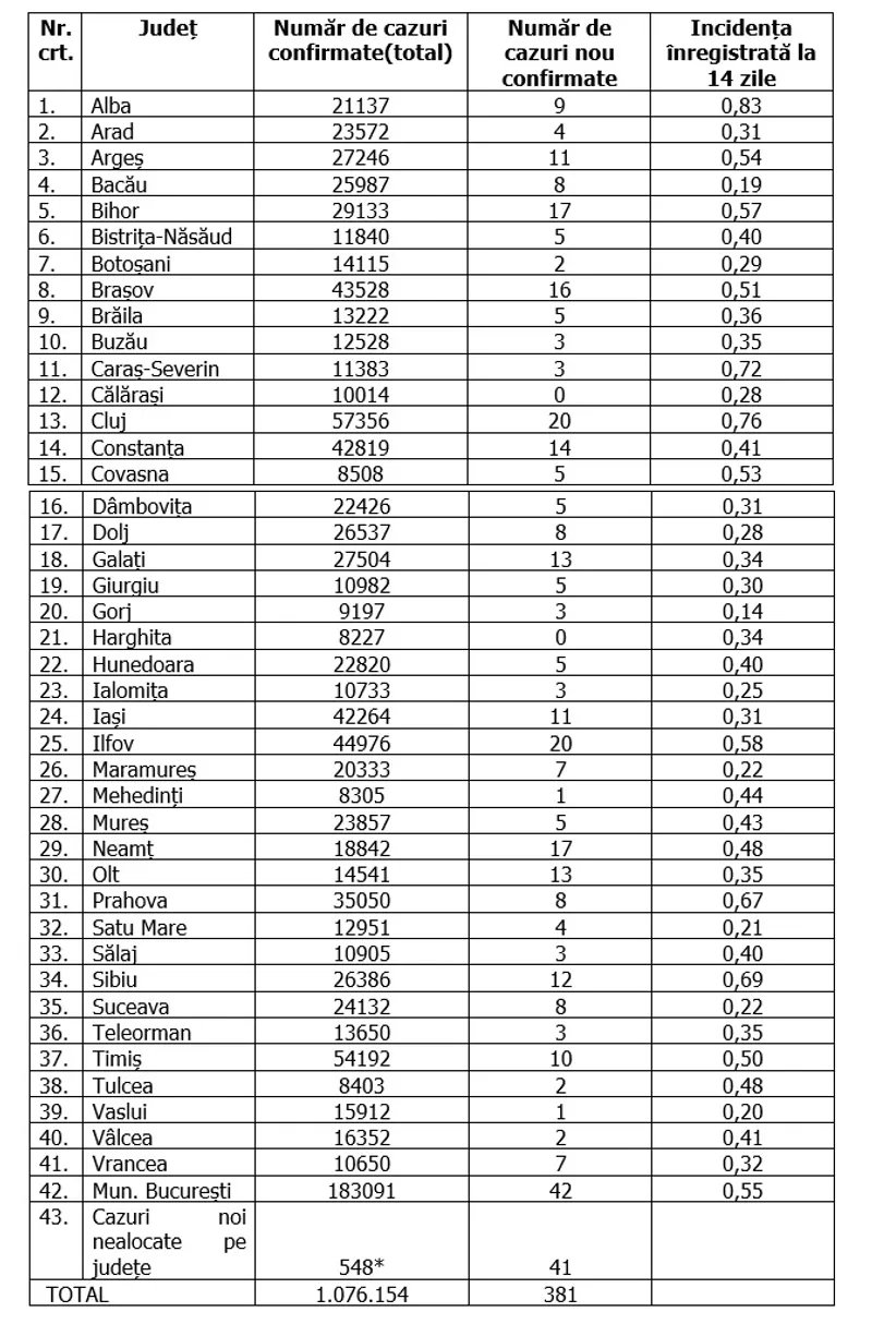 În total, în România au fost confirmate 1.076.154 de cazuri de infectare cu coronavirus, iar 30.040 de oameni infectați au murit.