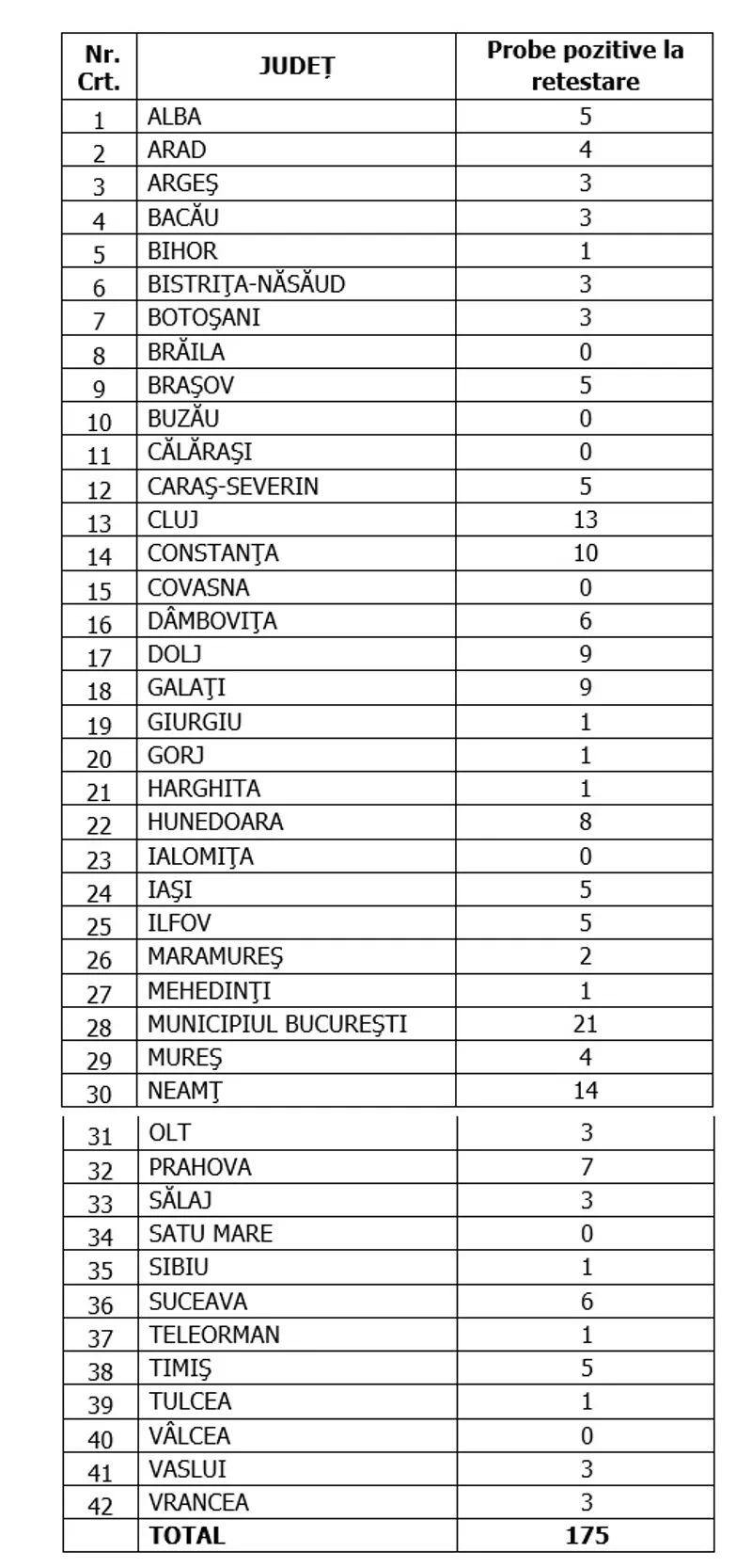Distinct de cazurile nou confirmate, în urma retestării pacienților care erau deja pozitivi, 175 de persoane au fost reconfirmate pozitiv.