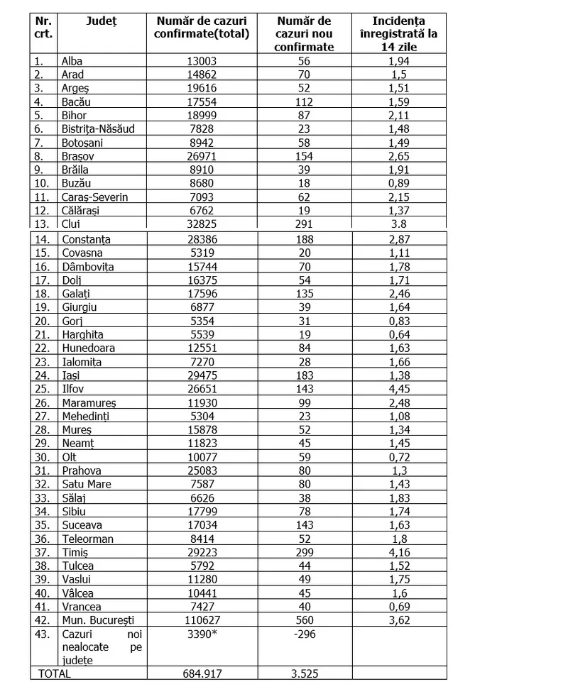 În total, în România au fost confirmate, până în prezent, 684.917 cazuri de infectare cu coronavirus, iar 17.035 de oameni infectați au murit.