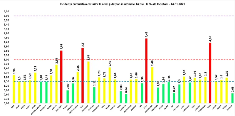 Coeficientul infectărilor cumulate la 14 zile, raportate la 1.000 de locuitori este calculat de către Direcțiile de Sănătate Publică, la nivelul Municipiului București și al județelor. Mai jos aveți graficul realizat în baza raportărilor primite de CNCCI de la Direcțiile de Sănătate Publică: