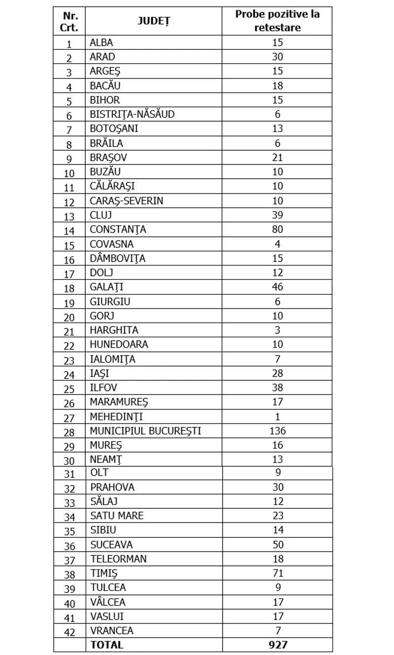 Distinct de cazurile nou confirmate, în urma retestării pacienților care erau deja pozitivi, 927 de persoane au fost reconfirmate pozitiv.