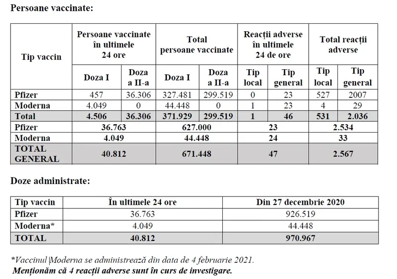 În total, de la debutul campaniei de vaccinare, din 27 decembrie, s-au imunizat 970.967 de persoane - 926.519 cu ser Pfizer și 44.448 cu ser Moderna. Au fost raportate 2.567 de reacții adverse, locale și generale. Cele mai multe reacții adverse au fost generale, adică febră, cefalee, mialgii (dureri musculare), artralgii, astenie, alergii de tip urticarie, iar 531 au fost locale (durere la locul înțepăturii).