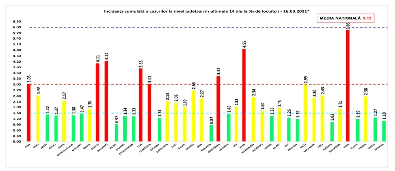Coeficientul infectărilor cumulate la 14 zile, raportate la 1.000 de locuitori este calculat de către Direcțiile de Sănătate Publică, la nivelul Municipiului București și al județelor. Mai jos aveți graficul realizat în baza raportărilor primite de CNCCI de la Direcțiile de Sănătate Publică: