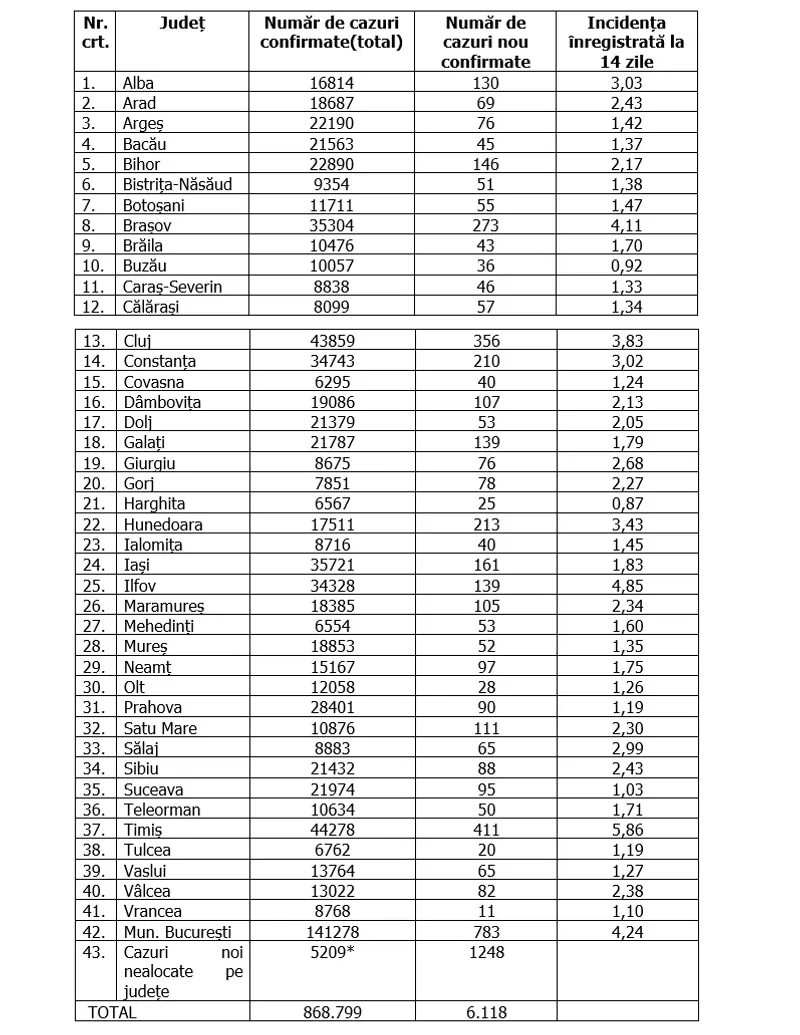 În total, în România au fost confirmate 868.799 de cazuri de infectare cu coronavirus, iar 21.698 de oameni care aveau boala au murit.