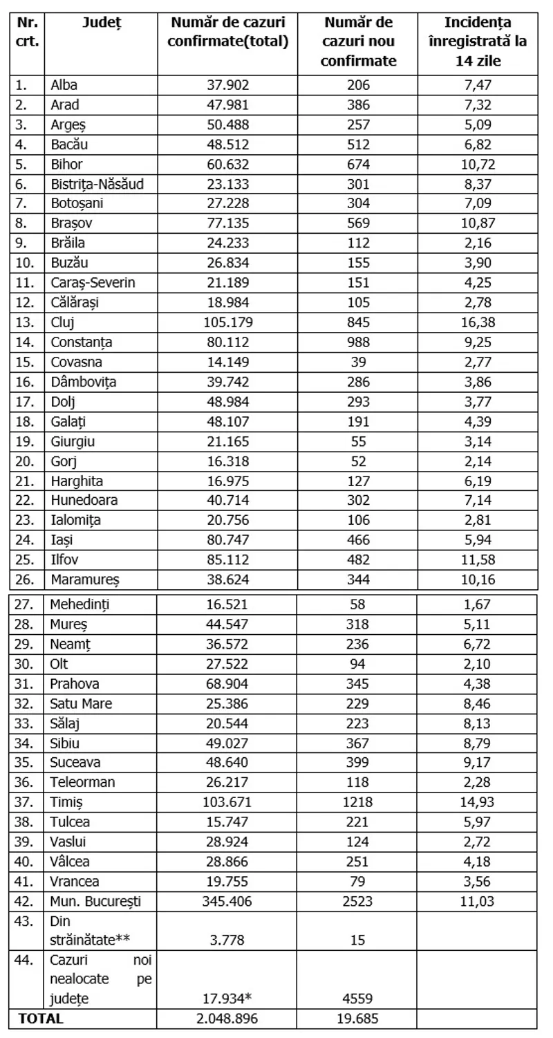 Distribuția pe județe a cazurilor per total și a celor noi o regăsiți în tabelul de mai jos: