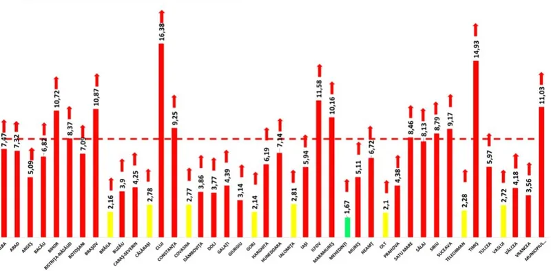Coeficientul infectărilor cumulate la 14 zile, raportate la 1.000 de locuitori este calculat de către Direcțiile de Sănătate Publică, la nivelul Municipiului București și al județelor. Mai jos aveți graficul realizat în baza raportărilor primite de CNCCI de la Direcțiile de Sănătate Publică: